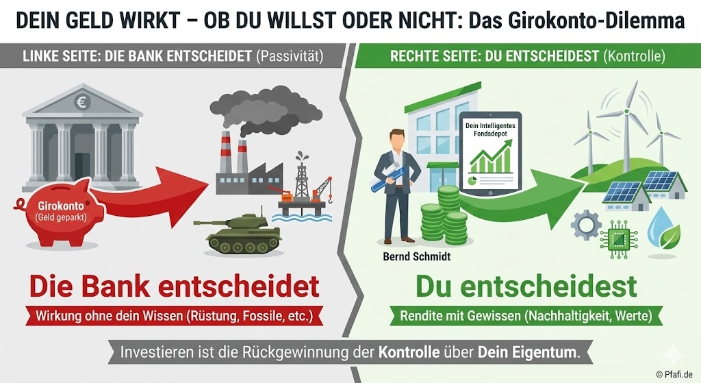 Fremdbestimmung: Dein Geld liegt dort nicht einfach rum. Die Bank arbeitet damit. Oft finanziert sie damit Dinge, die Du vielleicht ablehnst (z. B. Rüstung oder fossile Industrien). Das Fazit: Wer passiv bleibt, entscheidet sich für das System der Banken – und gegen den eigenen Vermögenserhalt.